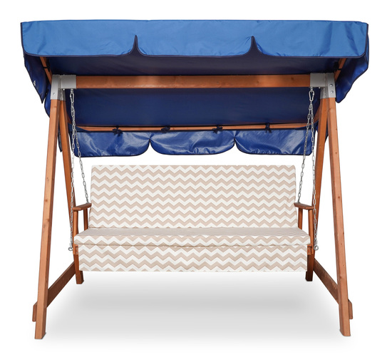 Это цветной матрас, предназначенный для садовых качелей, на него нанесён принт зигзага. Изготовлен данный матрас из европейской ткани с тефлоновым покрытием, в качестве наполнителя используется холлофайбер. Длина изделия составляет 155 см, толщина 5 см, глубина сидения 49 см, а высота спинки 55 см.