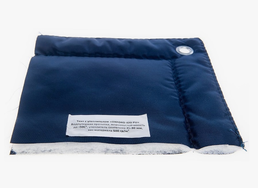Такие тенты изготавливаются из двух внешних полотен, выполненные из прочных водонепроницаемых материалов, внутри которых находится утеплитель изолон или синтепон толщиной 5 мм. Внешний слой аксессуара может состоять из брезента, оксфорда, полиуретана, тарпаулина. На поверхность изделия наносится специальный состав, который отталкивает ультрафиолетовые лучи и предотвращает налипанию пыли и грязи. Швы из лавсановых ниток выполнены методом сваривания горячим воздухом, которые дополнительно проклеиваются. По краям монтируются люверсы – отверстия, диаметром 11 мм.